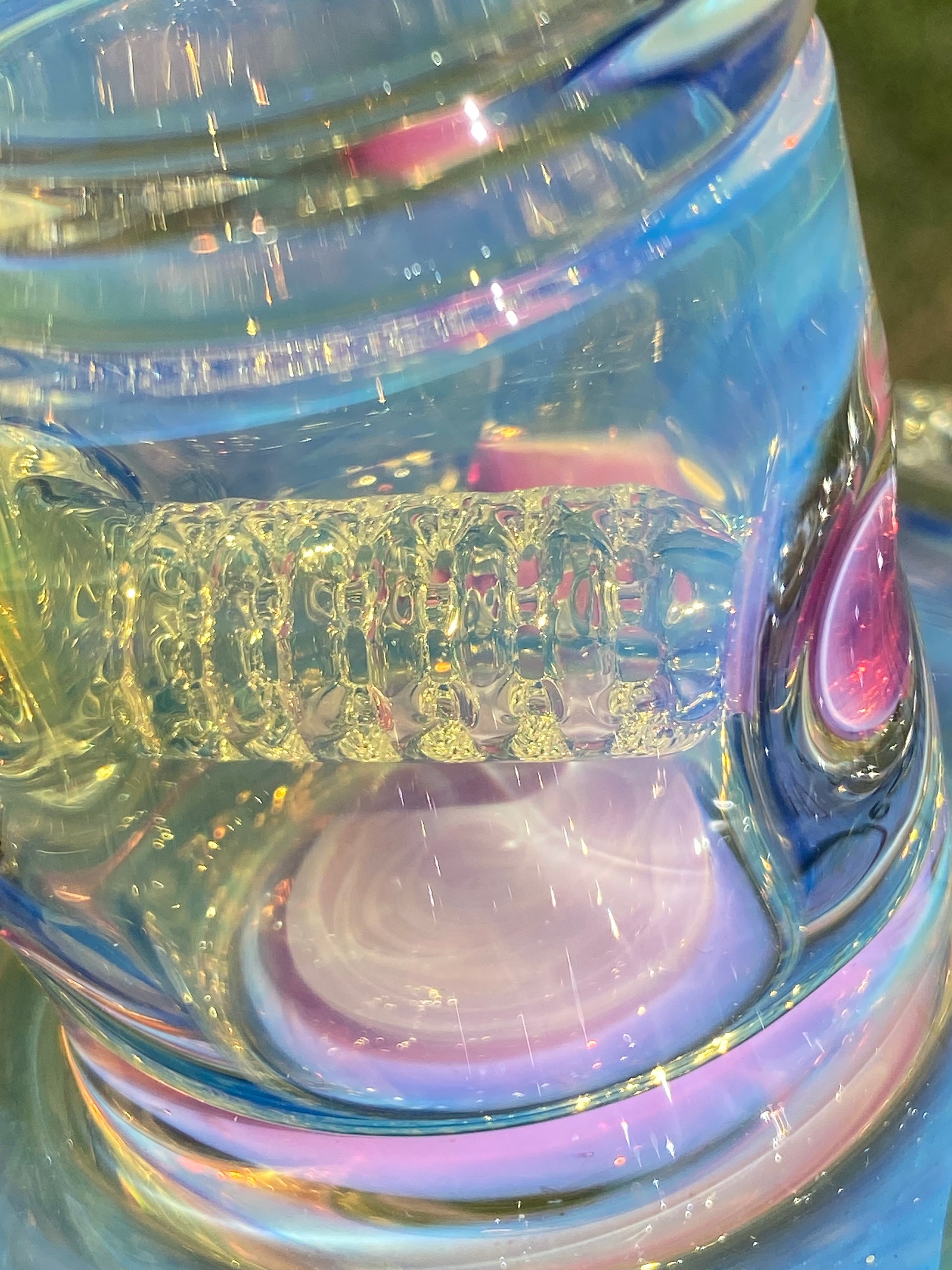 Featuring Apix’s signature stemline perc, this piece delivers exceptional percolation and effortless airflow for clean, flavorful pulls every time. The bent neck provides a comfortable draw angle while preventing splashback, and the iridescent finish shimmers under the light, highlighting the masterful shaping throughout the body. The uniquely flared base and organically inspired handle accents add both stability and individuality, marking it as a true collector’s piece.