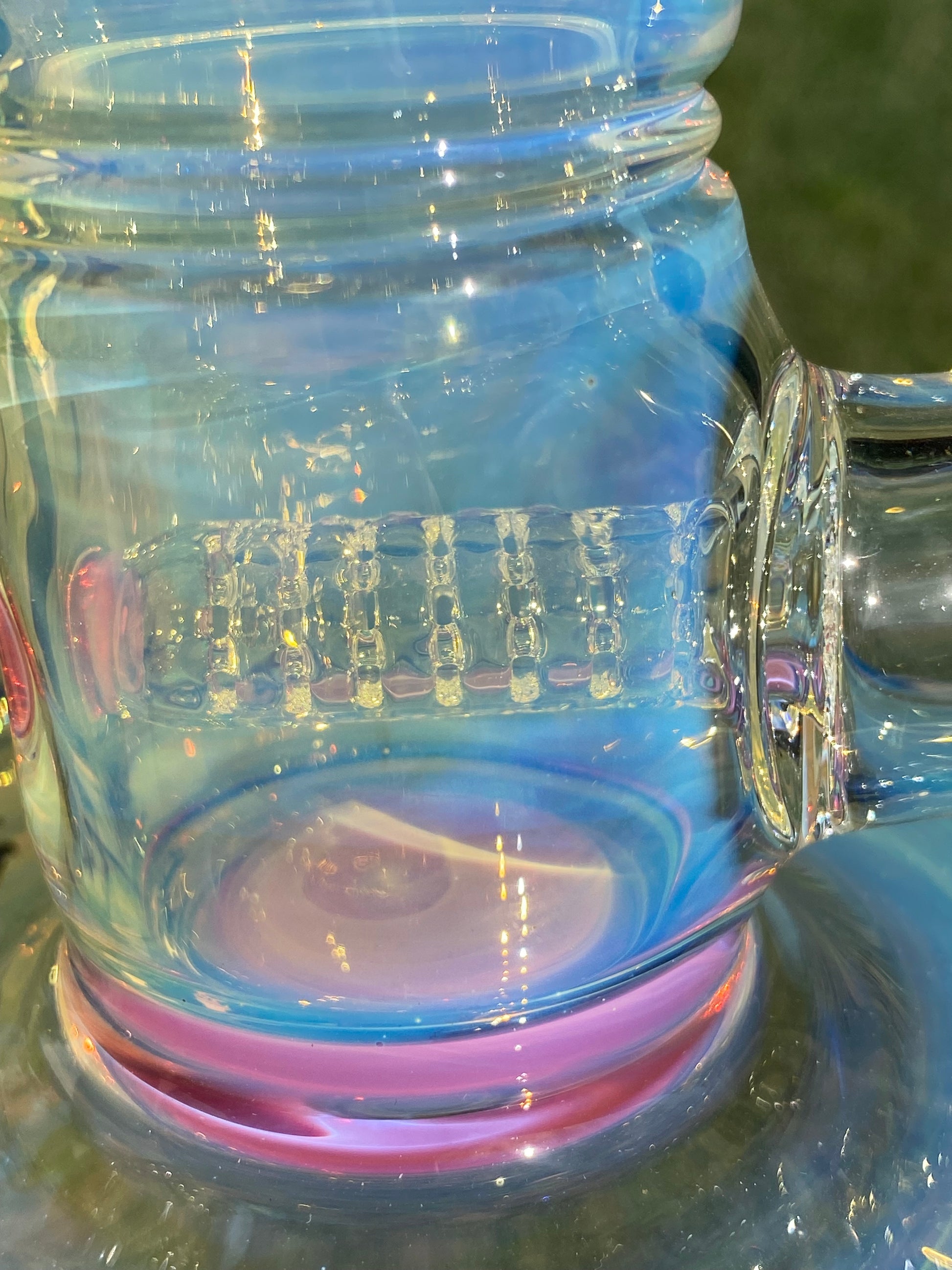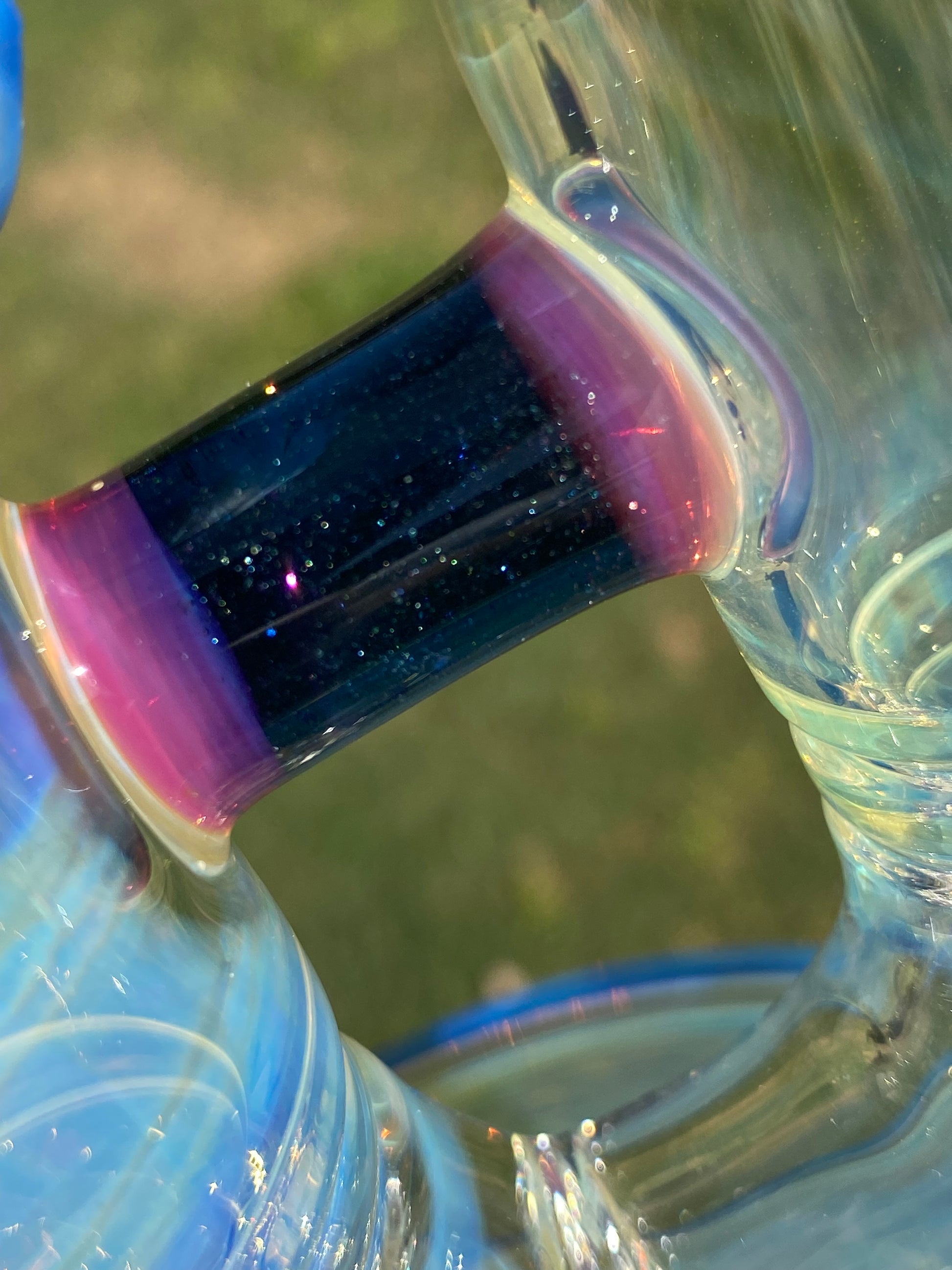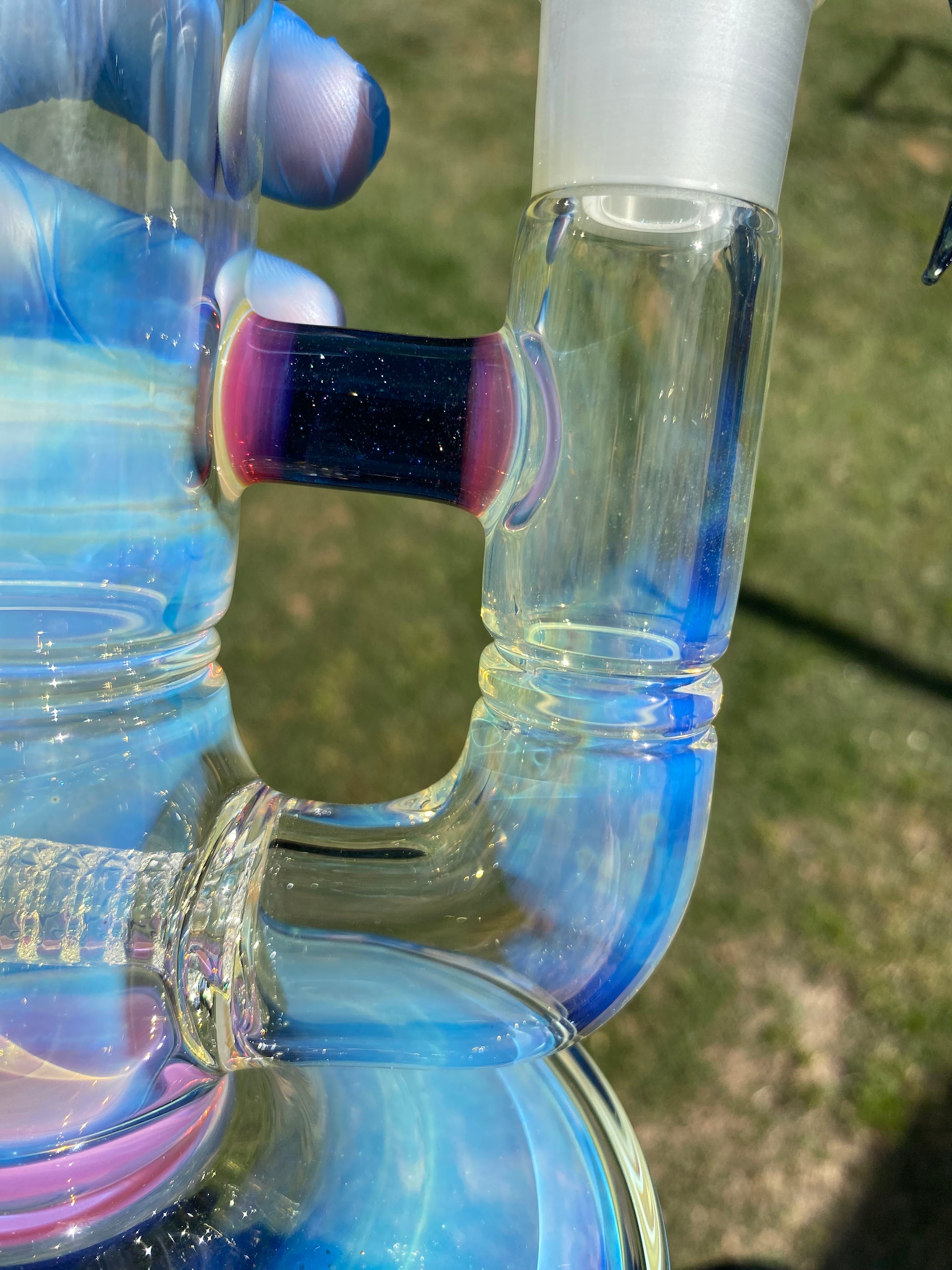 Engineered with Apix’s renowned stemline percolator, it provides powerful yet refined diffusion for smooth, flavor-rich pulls. The tall, straight neck ensures comfortable airflow and clean stacking, while the wide, iridescent base offers both stability and striking visual presence. The piece glows with soft, opalescent hues — an interplay of blues, purples, and golds — accentuating the handcrafted precision and dimensional depth unique to each creation.