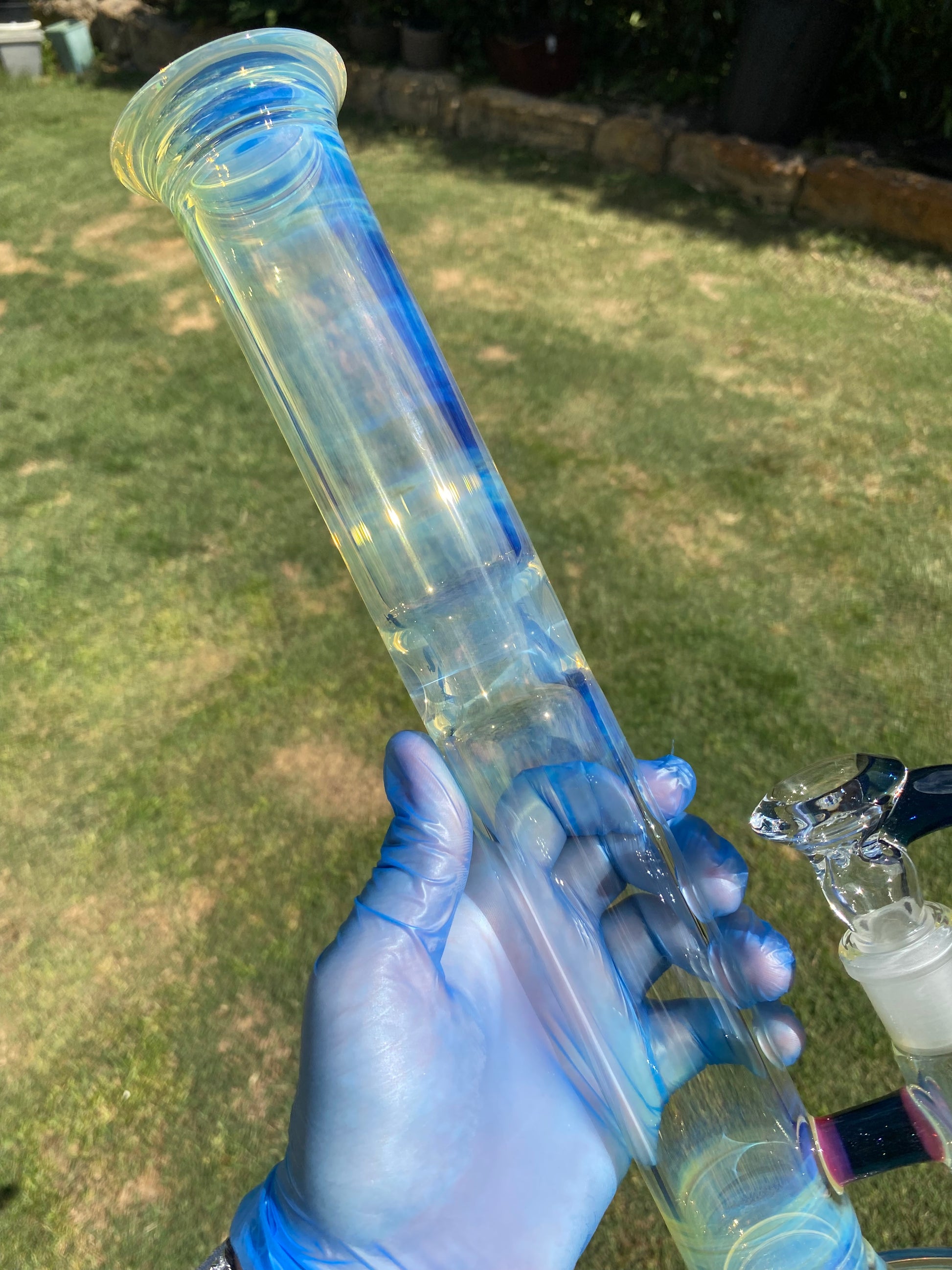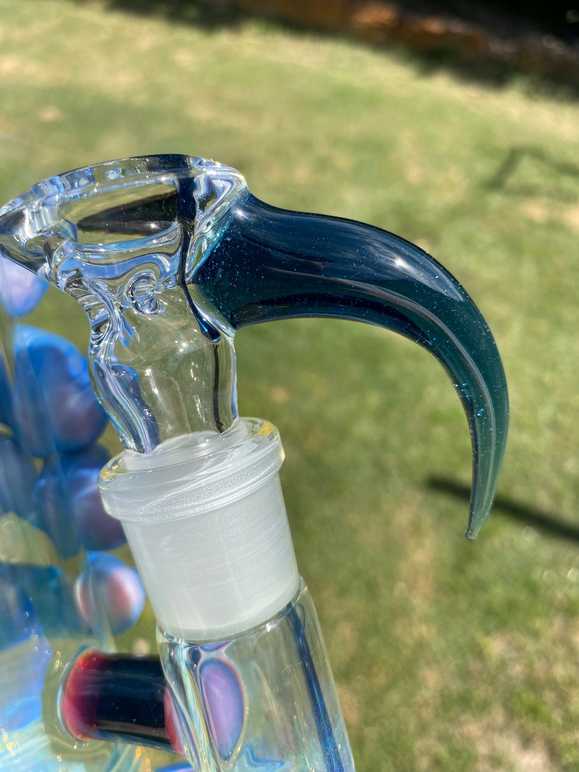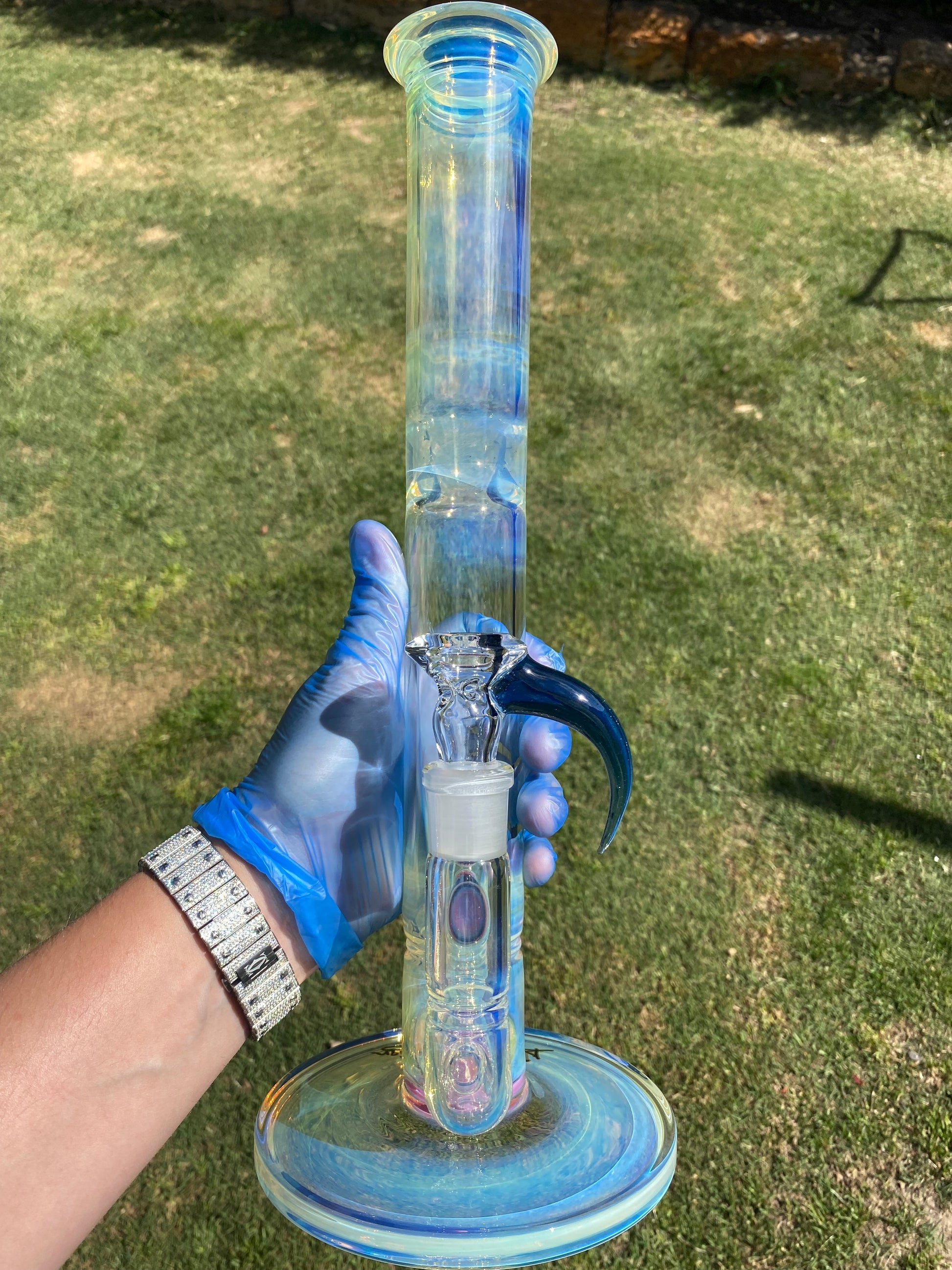 Engineered with Apix’s renowned stemline percolator, it provides powerful yet refined diffusion for smooth, flavor-rich pulls. The tall, straight neck ensures comfortable airflow and clean stacking, while the wide, iridescent base offers both stability and striking visual presence. The piece glows with soft, opalescent hues — an interplay of blues, purples, and golds — accentuating the handcrafted precision and dimensional depth unique to each creation.