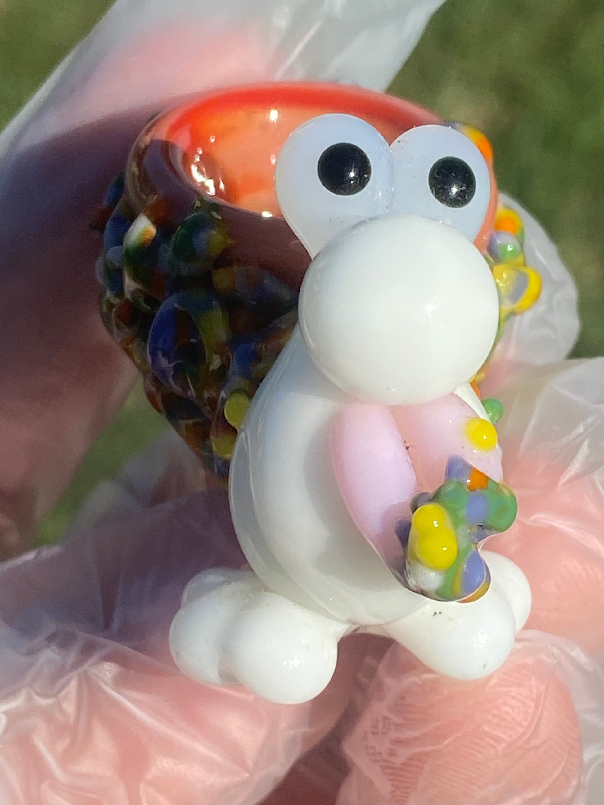 Where warmth meets craftsmanship, the Nerds Orange Slide blends playful creativity with elegant glass artistry. Its smooth, milky white form glows with soft translucence, while the deep orange bowl radiates a fiery brilliance that catches the light from every angle. Adorned with clusters of vivid candy like details, this piece embodies the joyful spirit of the Nerds collection bold, bright, and beautifully balanced.