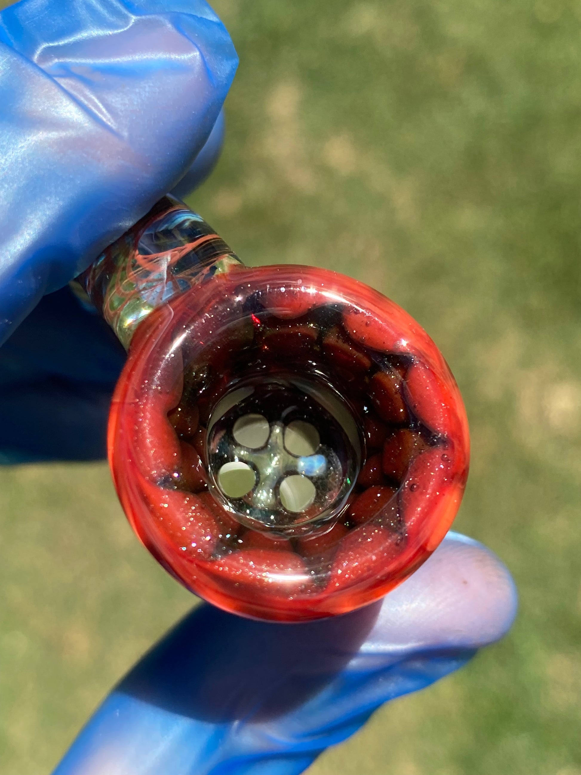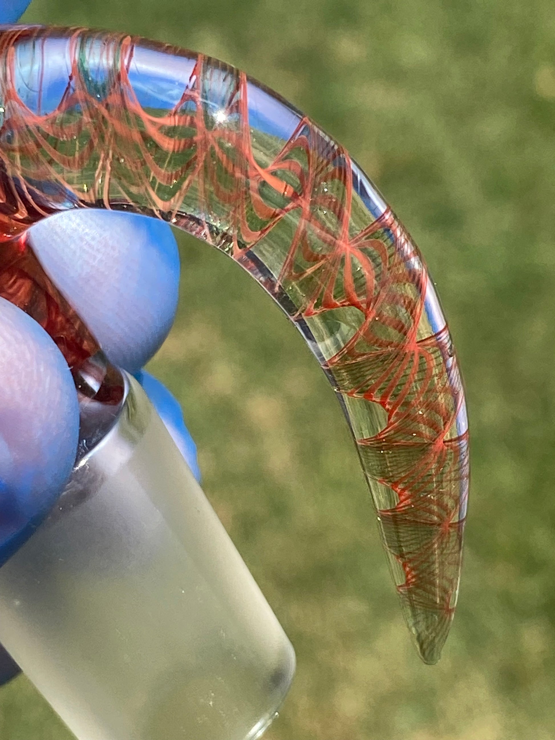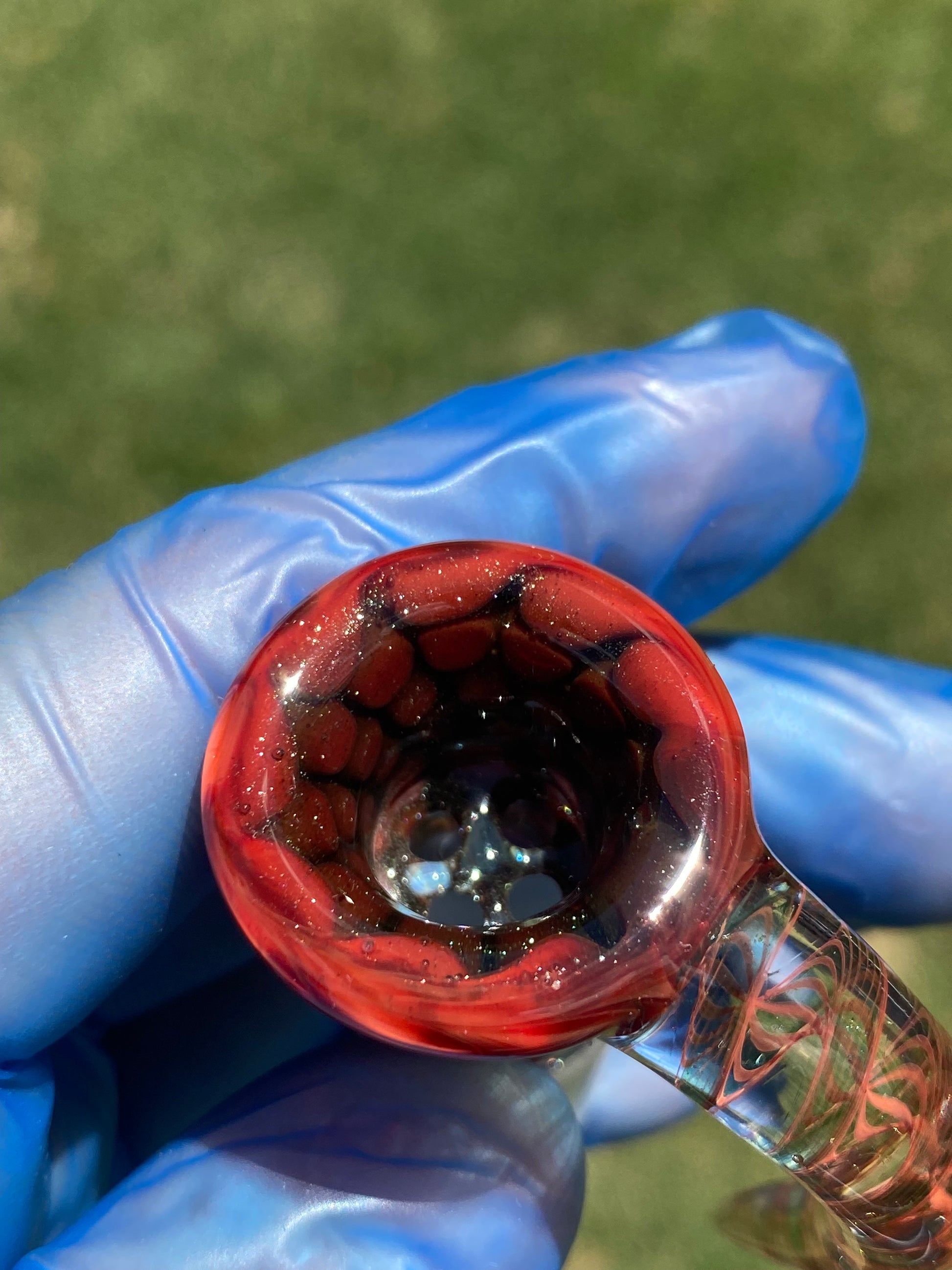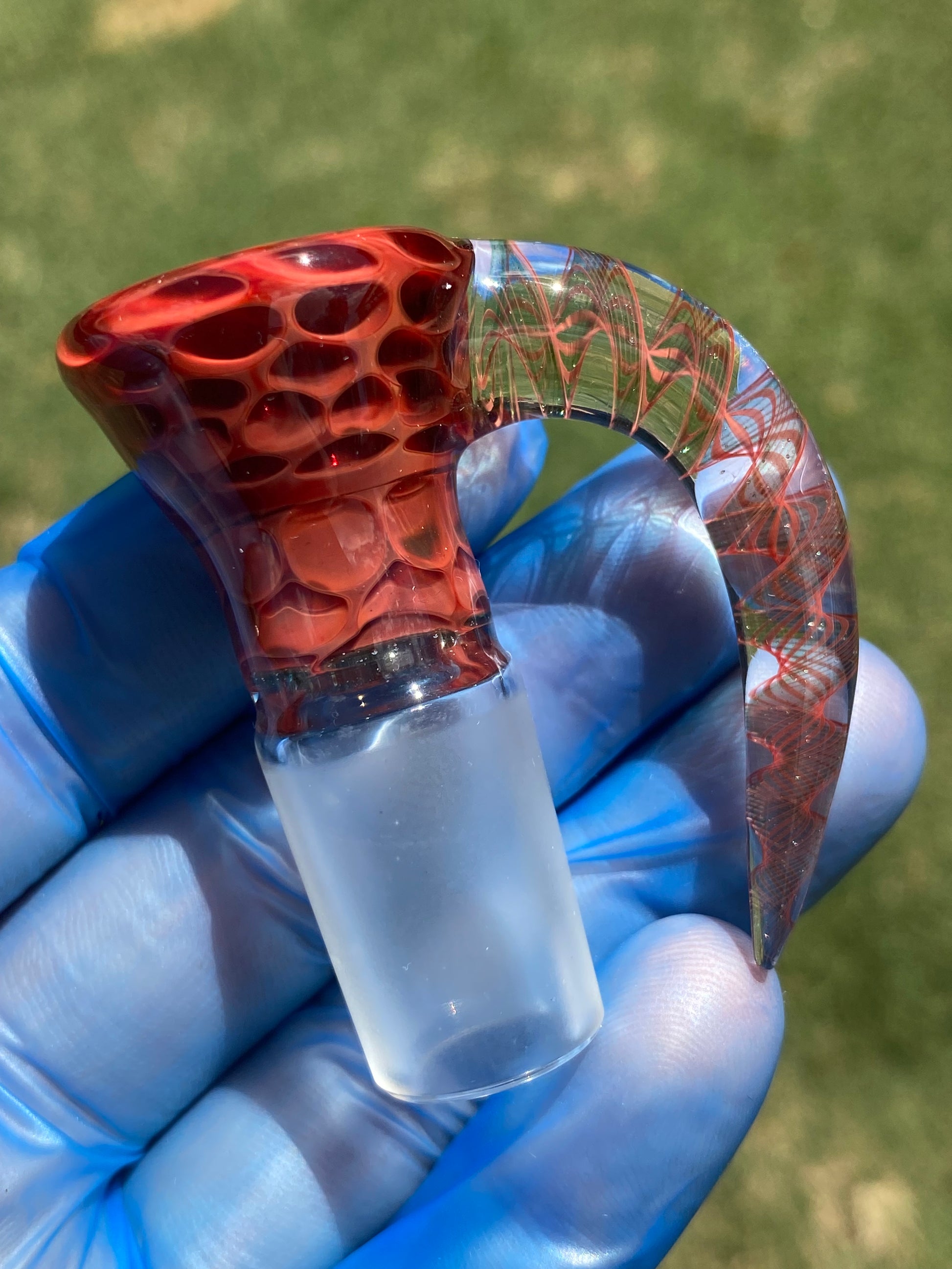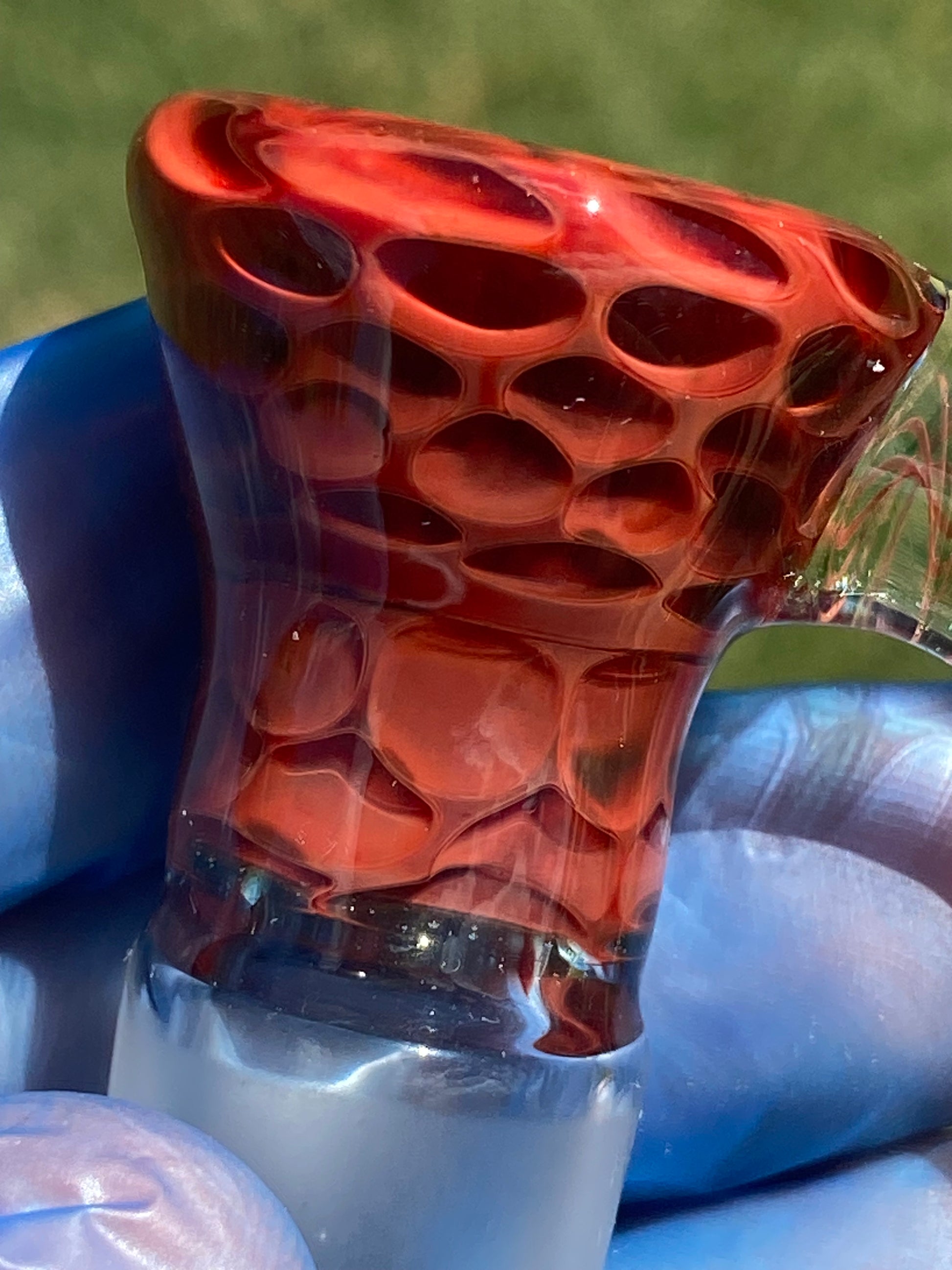 The bowl’s deep crimson body glows with a honeycomb texture, refracting light through its layered tones of scarlet and ember. Its sculpted horn handle, accented with intricate red linework inside clear glass, creates both visual movement and ergonomic comfort. Designed for form and function, this handcrafted slide blends dynamic colorwork with everyday reliability.