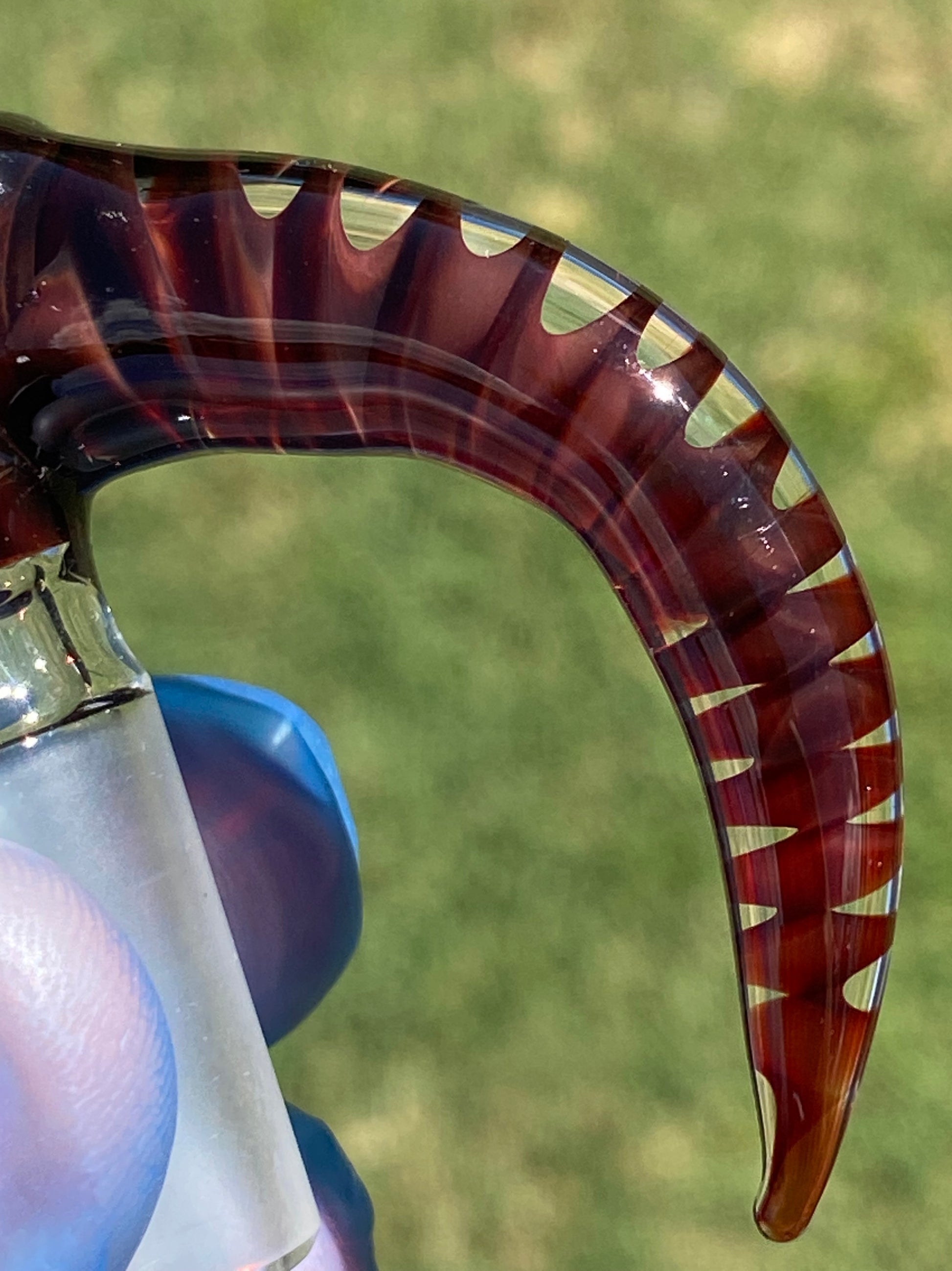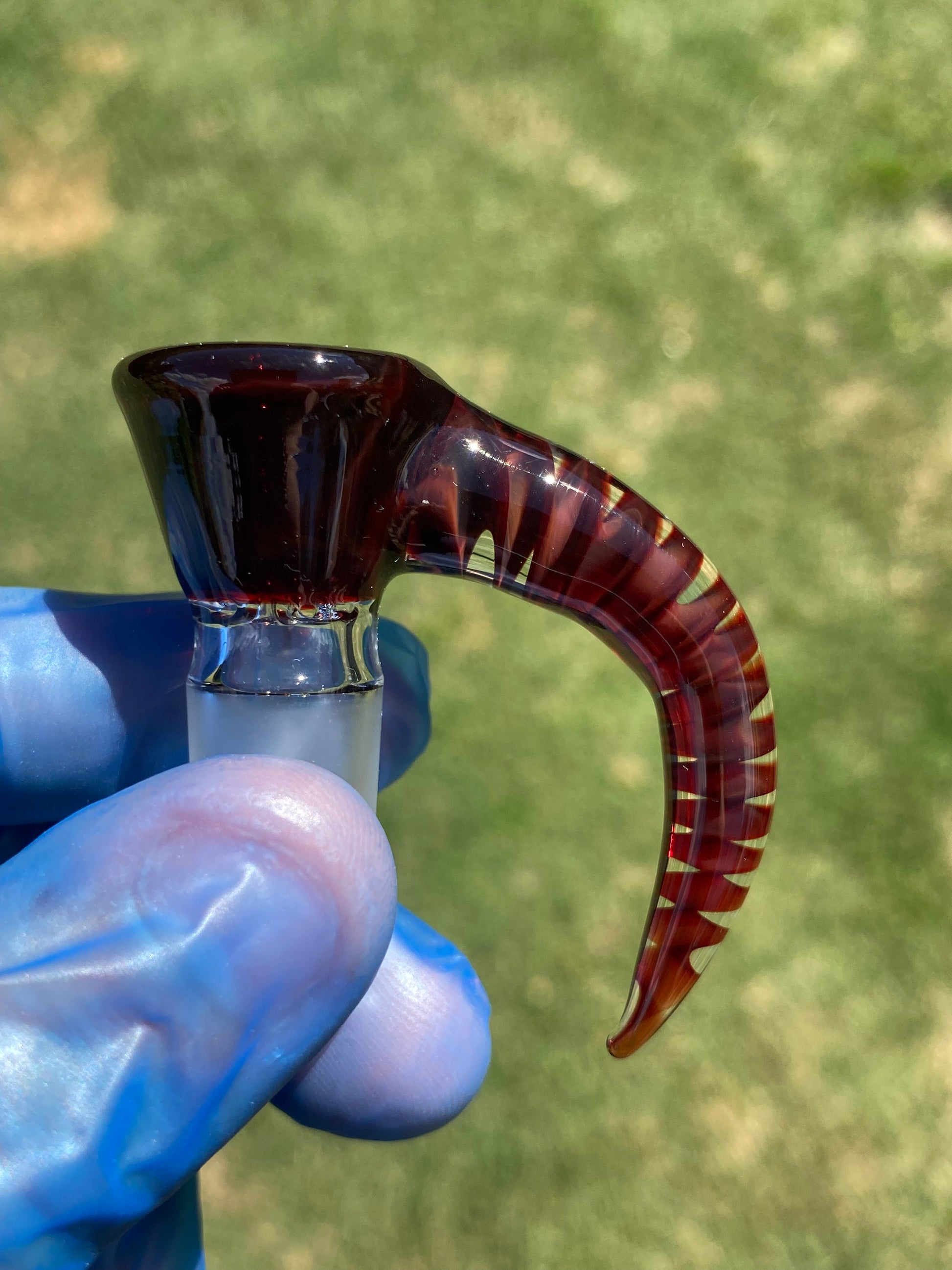 The Red Slide’s design showcases a sweeping horn style handle infused with striking ribbed accents, creating a sense of movement and flow that complements its vibrant coloration. Under natural light, its tones shift between rich garnet and glowing ember, capturing the warmth and energy of molten glass frozen in time.