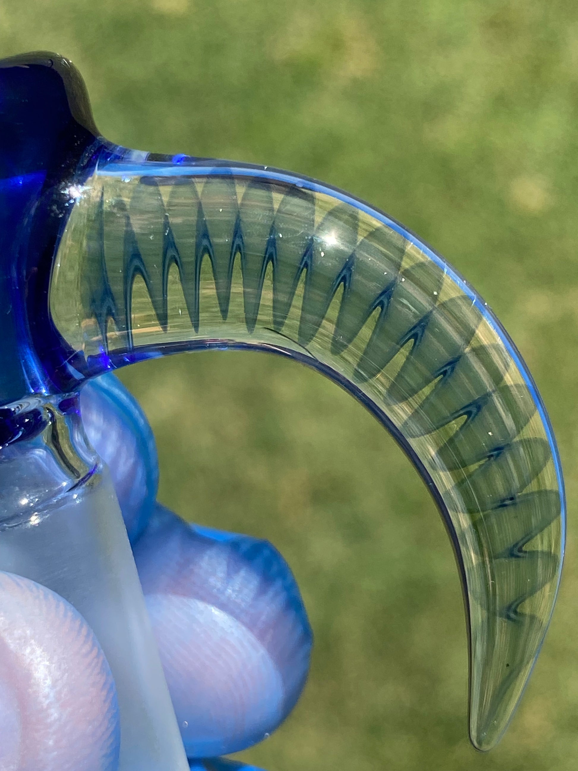 The horn-style handle arcs gracefully from the side, offering both ergonomic comfort and a touch of artistry. Each contour reflects the maker’s meticulous attention to form and function, ensuring a secure grip and seamless fit. The vibrant blue bowl captures and refracts light, evoking calm tones of ocean glass, while the transparent horn displays intricate linework that adds a subtle, technical aesthetic.